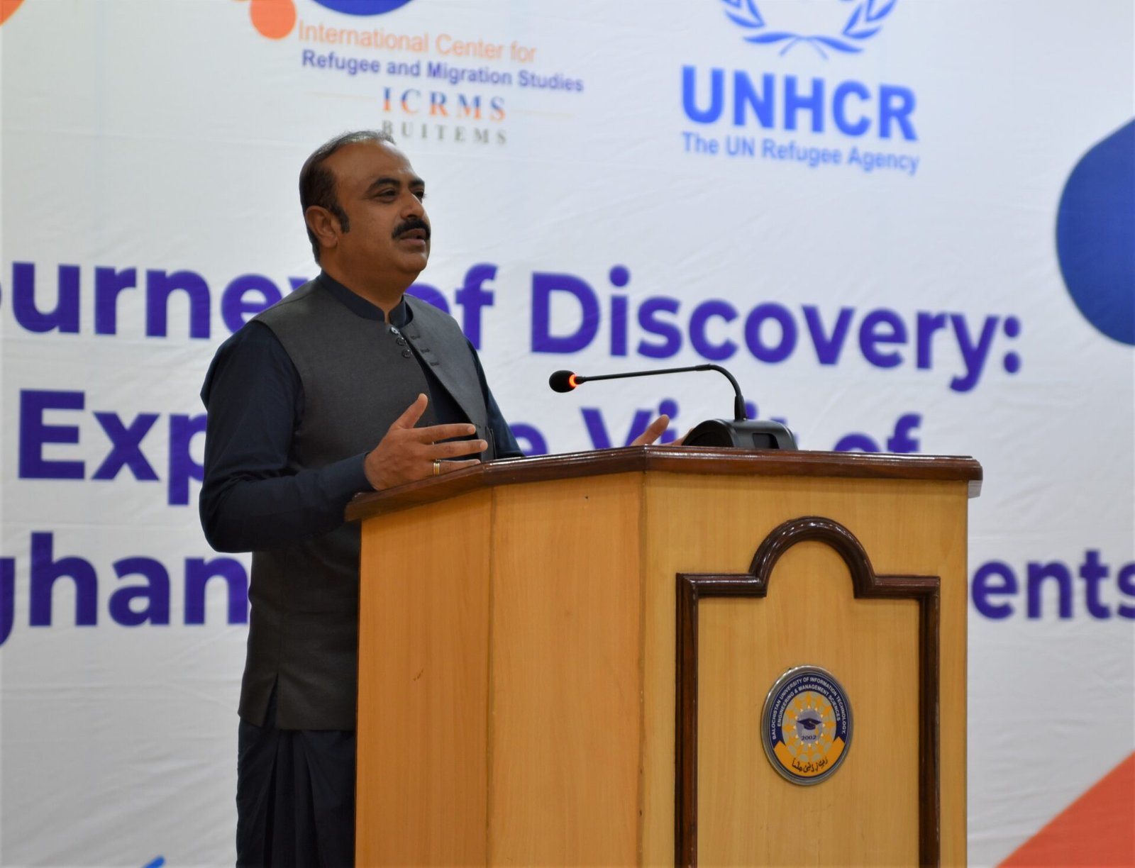 On August 30, 2023, the fifth exposure visit of the year 2023 was held by the International Center for Refugee and Migration Studies (ICRMS) at BUITEMS University, Quetta. A group of faculty members and students from School No. 49 of Surkhab Afghan refugee camp, along with members of civil society organizations, were invited for the exposure visit. The visitors were received by the ICRMS and BUITEMS staff, who gathered at the Orange Hall. The main purpose of the exposure visit was to inform Afghan refugee students about the opportunities and services available for them to access these resources and secure admission in the universities in Balochistan. The preliminary session for the exposure was moderated by Ms. Nafisa Nasar. The visit formally started with the recitation of the Holy Quran, followed by an introductory video of ICRMS that provided an insightful glimpse into the mission and objectives of ICRMS and encapsulated the heart and soul of the organization’s endeavors.