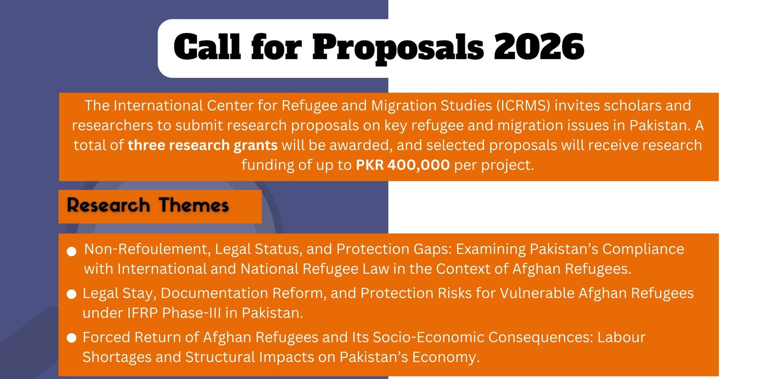 For the promotion of research on refugee issues, and to bring forth evidence-based debates forward, the ICRMS plans to provide three types of research grants, namely junior, senior and ICRMS lead research grants.